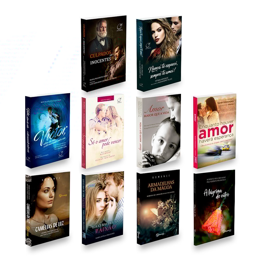 LIVROS NOVOS E FÍSICOS Este Kit Contém 1 exemplar de cada: ARMADILHAS DA MÁGOA - 208 páginas -16x23 cm - (Médium: Roberto de Carvalho / Ditado por: Jandira) CAMÉLIAS DE LUZ - NOVA EDIÇÃO - 384 páginas -16x23 cm - (Médium: Cirinéia Iolanda Maffei / Ditado por: Antonio Frederico) CULPADOS OU INOCENTES? - 400 páginas -15,5x22,5 cm - (Médium: Maria Nazareth Dória / Ditado por: Luís Fernando (Pai Miguel de Angola)) ENQUANTO HOUVER AMOR HAVERÁ ESPERANÇA - 304 páginas -16x23 cm - (Médium: Sarah Kilimanjaro / Ditado por: Vinícius) LÁGRIMA DO OUTRO (A) - 192 páginas -15,5x22,5 cm - (Médium: Roberto de Carvalho / Ditado por: Francisco) LOUCURAS DE UMA PAIXÃO - 208 páginas -16x23 cm - (Autor: Maria Estela Orlandeli) NUNCA TE ESQUECI, SEMPRE TE AMEI! - 224 páginas -16x23 cm - (Médium: Fátima Arnolde / Ditado por: Alexandre Villas) Victor, Além da Vida... e Eternamente Entre Nós - 288 páginas - 15.50 x 22.50 Médium: Eliana Machado Coelho / Médium: Maria Lúcia Gallinaro / Autor: Marisa Rita Riello Deppman / Ditado por: Victor Hugo Deppman QUANDO O AMOR VENCE O ÓDIO - 320 páginas -16x23 cm - (Médium: Marlene Saes / Ditado por: Luizinho) UM NOVO DIA PARA AMAR - 392 páginas - 16x23 cm ( Médium: Célia Xavier de Camargo / Ditado Por: Paulo Hertz) SÓ O AMOR PODE VENCER - 248 páginas - 14x21cm - (Médium: Eliane Macarini / Ditado Por: Maurício) AMOR MAIOR QUE A VIDA - 320 páginas - 16x23 cm - ( Médium: Tania Queroz / Ditado Por: Marcuz Vinícius )